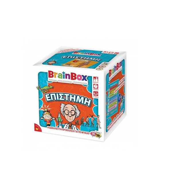 Στο παιχνίδι ΕΠΙΣΤΗΜΗ παρουσιάζονται οι πιο μεγάλες ανακαλύψεις στον επιστημονικό κόσμο. Από την εξέλιξη της ανθρωπότητας ως τον κύκλο ζωής των φυτών και τα υλικά που αλλάζουν κατάσταση, αυτό το οικογενειακό παιχνίδι περιέχει ειδικά σχεδιασμένες εικόνες που ζωντανεύουν κάθε επιστημονική ιδέα. Θα παίζουµε µαζί και θα µάθουµε µαζί µε το BrainBox ΕΠΙΣΤΗΜΗ. Αναποδογύρισε την κλεψύδρα και προσπάθησε να μάθεις απ’έξω την κάρτα σε 10 δευτερόλεπτα! Τώρα ρίξε το ζάρι και απάντησε στην αντίστοιχη ερώτηση. Αν απαντήσεις σωστά κρατάς την κάρτα, αν απαντήσεις λάθος βάζεις την κάρτα πάλι μέσα στο BrainBox. Σκοπός του παιχνιδιού: Μάζεψε τις περισσότερες κάρτες μέσα σε 10 λεπτά. Περιέχονται: 55 κάρτες 1 κάρτα με κανόνες 1 κλεψύδρα 1 ζάρι