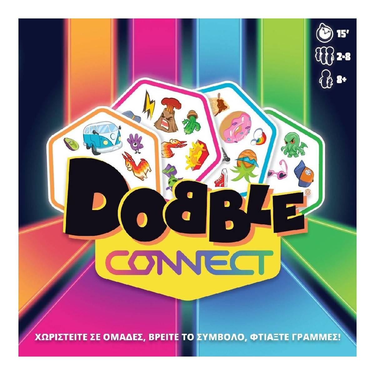 Παίχτες: 2-8 Ηλικία: 8+ Διάρκεια παιχνιδιού: 15′ Γλώσσες: Ελληνικά Το Dobble Connect αποτελείται από 90 κάρτες που περιέχουν 10 σύμβολα η καθεμία, και πάνω από 91 συνολικά σύμβολα. Όποιες 2 κάρτες να πάρετε, έχουν 1 – και μόνο 1 – κοινό σύμβολο. Ετοιμαστείτε να το βρείτε! Παίξτε ως ομάδες ή κάθε παίκτης μόνος του, για να γίνετε ο πρώτος ή η πρώτη που θα σχηματίσει μια γραμμή 4 καρτών του χρώματός του! Περιεχόμενα: 90 κάρτες, κανόνες