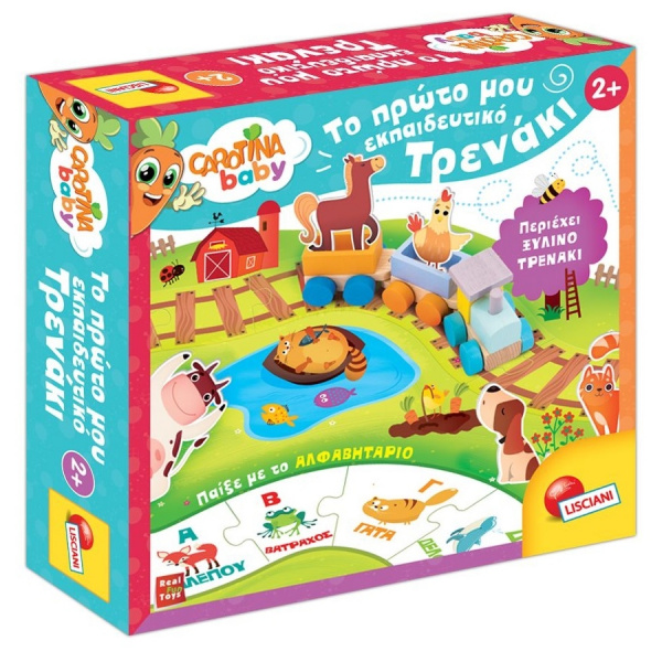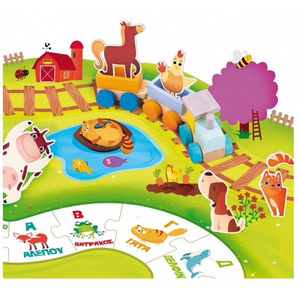 Ένα χαρούμενο ξύλινο τρενάκι για να εξερευνήσετε τη μεγάλη φάρμα με μία όμορφη διαδρομή! Περιέχει επίσης πολύχρωμο εκπαιδευτικό βιβλίο αλφάβητου. Περιεχόμενα: •Ξύλινο τρενάκι • Παζλ φάρμας 70×50 εκ. με ζώα ενσφηνώματα • Αλφαβητάριο • Οδηγίες