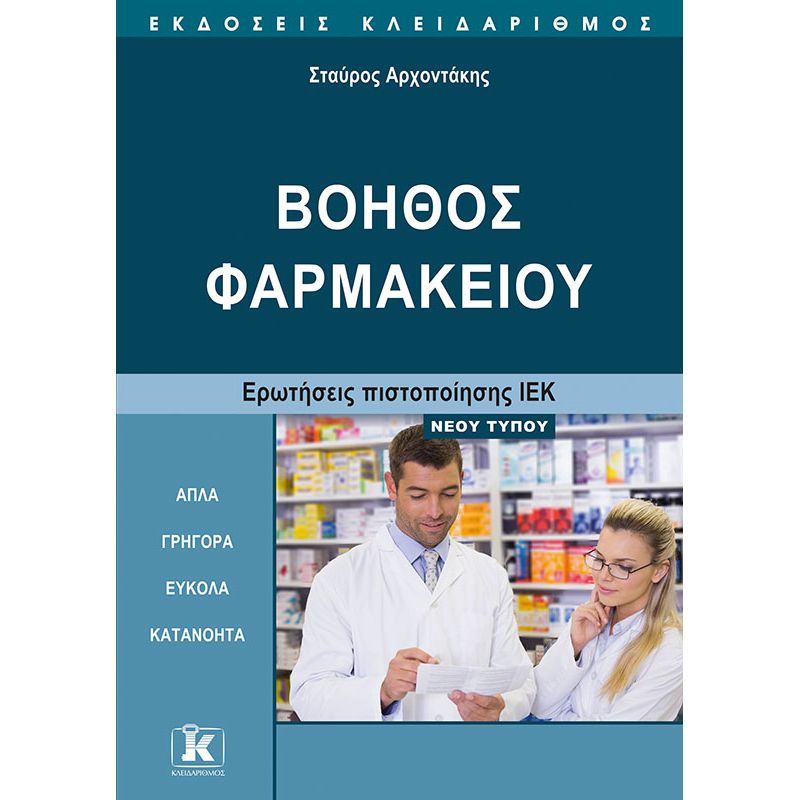 Ερωτήσεις πιστοποίησης ΙΕΚ ΝΕΟΥ ΤΥΠΟΥ. Απαραίτητες καθημερινές γνώσεις για τους Βοηθούς Φαρμακείου. Το βιβλίο περιέχει τα θέματα του θεωρητικού μέρους των εξετάσεων Πιστοποίησης ΙΕΚ για την ειδικότητα «Βοηθός Φαρμακείου». Οι απαντήσεις των ερωτήσεων είναι γραμμένες με τρόπο απλό, κατανοητό αλλά και ολοκληρωμένο, με σκοπό να διευκολύνουν στη μελέτη τους σπουδαστές που επιθυμούν γρήγορα και ουσιαστικά αποτελέσματα. Ωστόσο, το βιβλίο δεν απευθύνεται μόνο σε σπουδαστές ΙΕΚ. Περιέχει χρήσιμες πληροφορίες για οποιονδήποτε θέλει να αποκτήσει ουσιαστικές γνώσεις για τις αρμοδιότητες ενός βοηθού φαρμακείου, οι οποίες μπορεί να αποδειχθούν πολύτιμες στο μέλλον –τόσο στον ίδιο όσο και στους οικείους του.