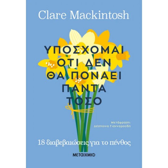 Το πένθος είναι οικουμενικό, όμως είναι και τόσο μοναδικό για τον καθένα μας όσο και ο άνθρωπος που χάσαμε. Όταν η συγγραφέας μπεστ σέλερ Clare Mackintosh έχασε το πέντε εβδομάδων μωρό της, κατέφυγε στα βιβλία για να βρει βοήθεια. Τα βιβλία της έλεγαν τι θα έπρεπε να νιώθει και πότε θα έπρεπε να το νιώθει, η αλήθεια όμως –όπως έμαθε πολύ γρήγορα η Clare– είναι ότι δεν υπάρχουν ξεκάθαρα οριοθετημένα στάδια για το πένθος ούτε εύκολες συνταγές που θα μας ανακουφίσουν από τον πόνο μας. Αυτό που έχουμε ανάγκη όταν πενθούμε είναι χρόνος και κατανόηση. Το Υπόσχομαι πως δεν θα πονάει πάντα τόσο είναι το βιβλίο που είχε ανάγκη τότε η συγγραφέας. Όταν δεν μπορείς να συγκεντρωθείς, όταν γυρεύεις παρηγοριά, όταν ψάχνεις ελπίδα, όταν απλά θέλεις να πετάξεις κάτι στον τοίχο και όταν έχεις ανάγκη κάποιον να σε διαβεβαιώσει και να συνεχίσει να σε διαβεβαιώνει, η συγγραφέας πολύ γλυκά θυμίζει: Δεν θα πονάει έτσι για πάντα, σου το υπόσχομαι.